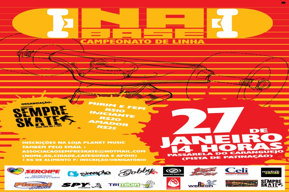 A pista de patinação Larissa Barata na orla de Atalaia será palco do 3º Circuito Sergipe de Skate na Base. O evento que ocorrerá no dia 27 de janeiro, a partir das 14h. Participarão do campeonato atletas das categorias amador (principal), mirim, feminino e iniciante.