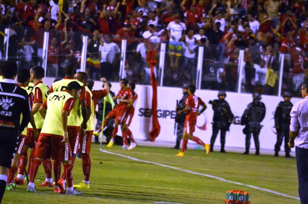 Quando o Sergipe decidiu ir pela primeira vez ao ataque com alguma contundência, chegou ao gol. Aos 11, após cruzamento da direita, Hiago apareceu no segundo pau para cabecear pra dentro. A bola ainda bateu em Max, tocou na trave e entrou para abrir o marcador: Sergipe 1 a 0. No minuto seguinte, a arbitragem teve de interromper a partida graças à fumaça dos sinalizadores da torcida do Sergipe. Após idas e vindas da segurança local, o jogo prosseguiu.
