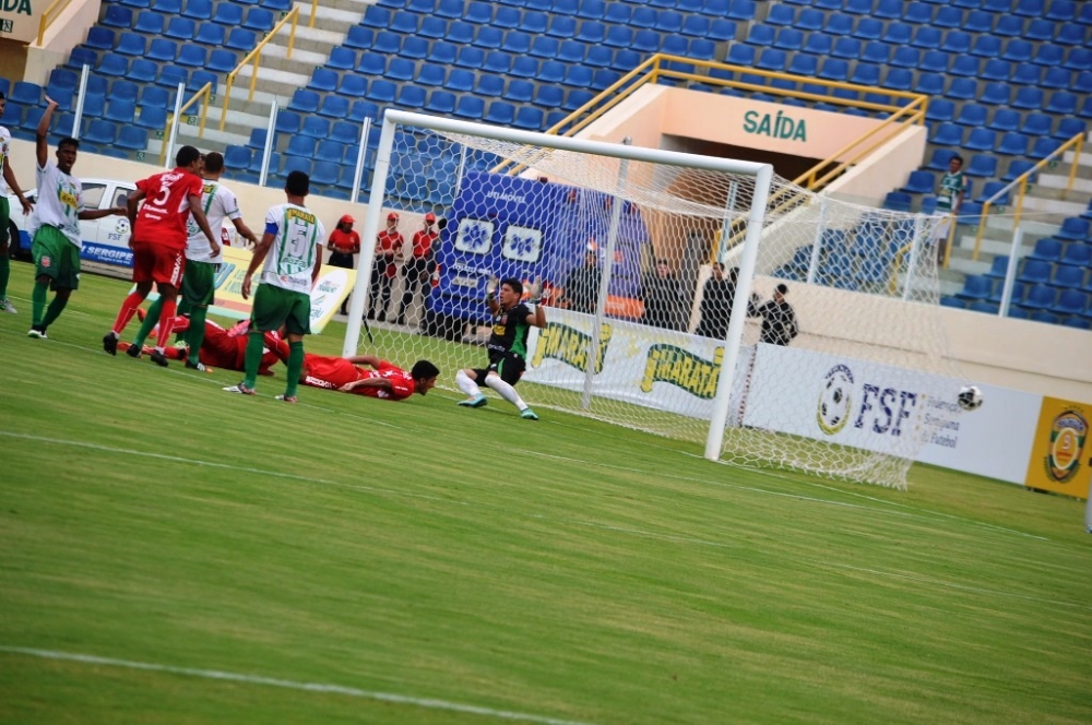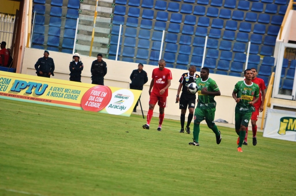 Foram quase 15 minutos sem nada de interessante acontecer na partida – e nenhum chute a gol – até que uma falta para o Sergipe surgiu próxima à grande área do Lagarto. Após suspense, Marcinho Beija-Flor se apresentou para bater. Na cobrança, o goleiro Emanuel sequer se mexeu e a bola foi para o ângulo esquerdo, nas redes: Sergipe 1 a 0.