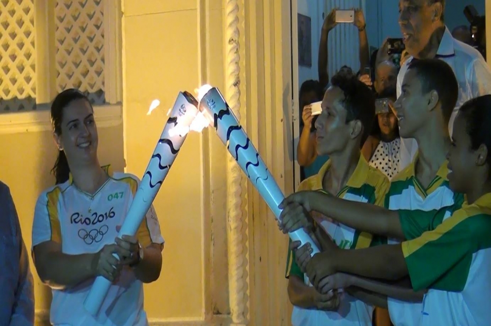 | Roberta Salgado, primeira condutora da tocha em Aracaju, acende o símbolo olímpico (Foto: Portal Infonet) |