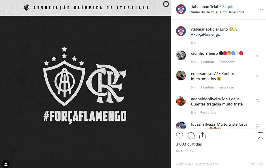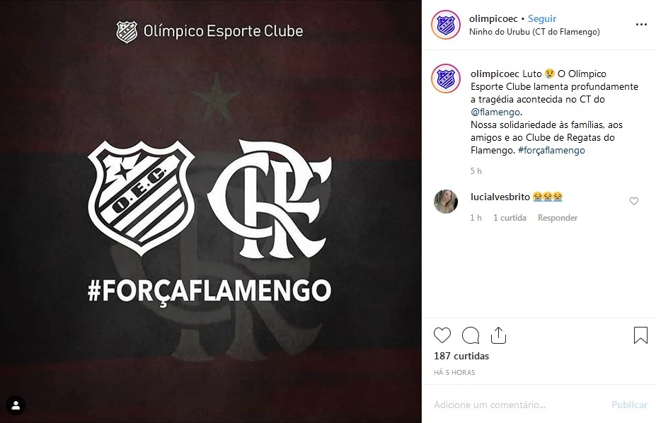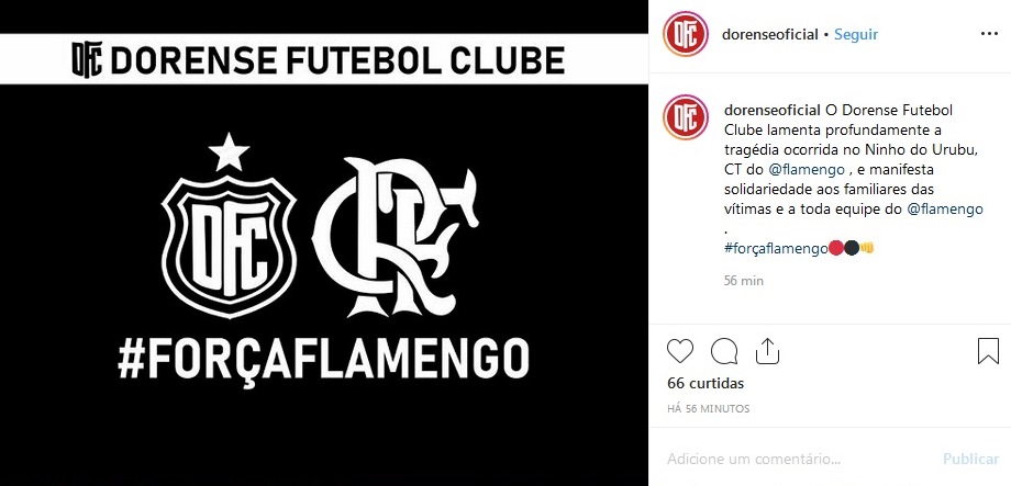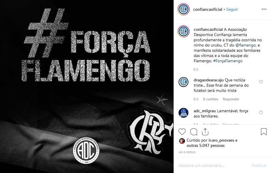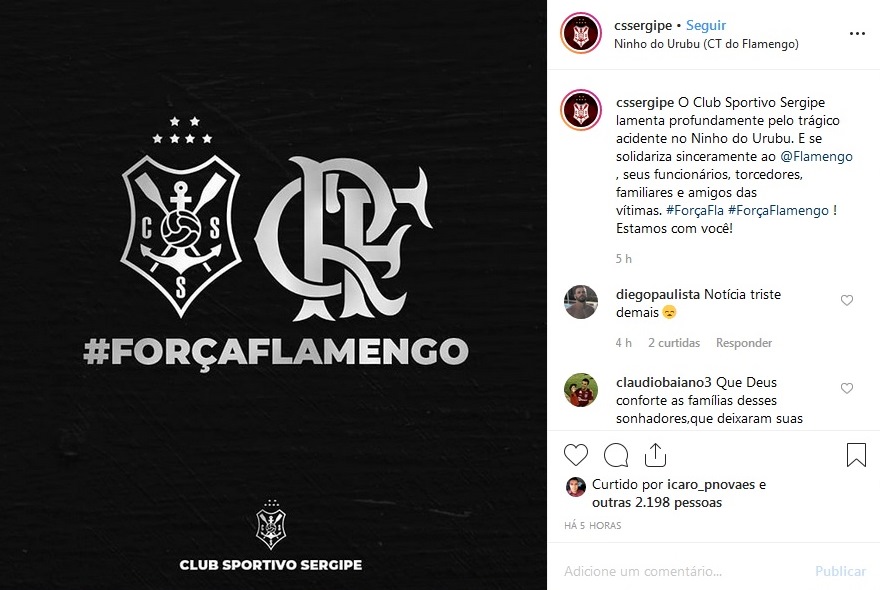 Diversos times sergipanos manifestaram solidariedade ao Flamengo em decorrência do incêndio que vitimou 10 pessoas – entre elas o sergipano Áthila Paixão – e feriu outras quatro nesta sexta-feira, 8, no Centro de Treinamento do rubro-negro no Rio de Janeiro. Em suas redes sociais oficiais, Confiança, Sergipe, Itabaiana, Dorense, Lagarto, Frei Paulistano e Olímpico – todos da primeira divisão do Campeonato Sergipano – deixaram mensagens de solidariedade ao clube e às famílias das vítimas. Confira na galeria.