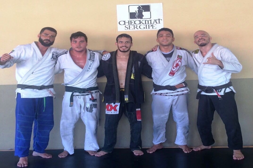 | Parceria: Rodrigo, de quimono preto, cercado pelos companheiros de treino |