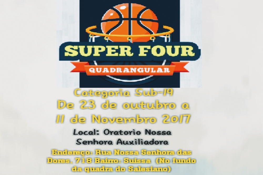 Aracaju promove o 'Super Four', torneio de basquete categoria sub-19. A competição acontece de 23 de outubro a 11 de novembro e os jogos serão realizados na quadra do Oratório Nossa Senhora Auxiliadora na Rua Nossa Senhora das Dores, nº 718 no Bairro Suissa no fundo da quadra do colégio Salesiano.