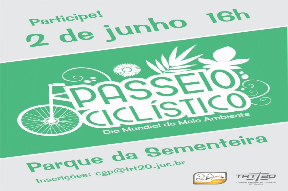Os Tribunais do Trabalho e Eleitoral, de Sergipe, promoverão um passeio ciclístico para marcar o Dia Mundial do Meio Ambiente, realizado em 2 de junho. Pelo quarto ano consecutivo, os dois órgãos reunirão magistrados, servidores e seus familiares para lembrar a data. O passeio ciclístico sairá do Parque da Sementeira, a partir das 16 horas.