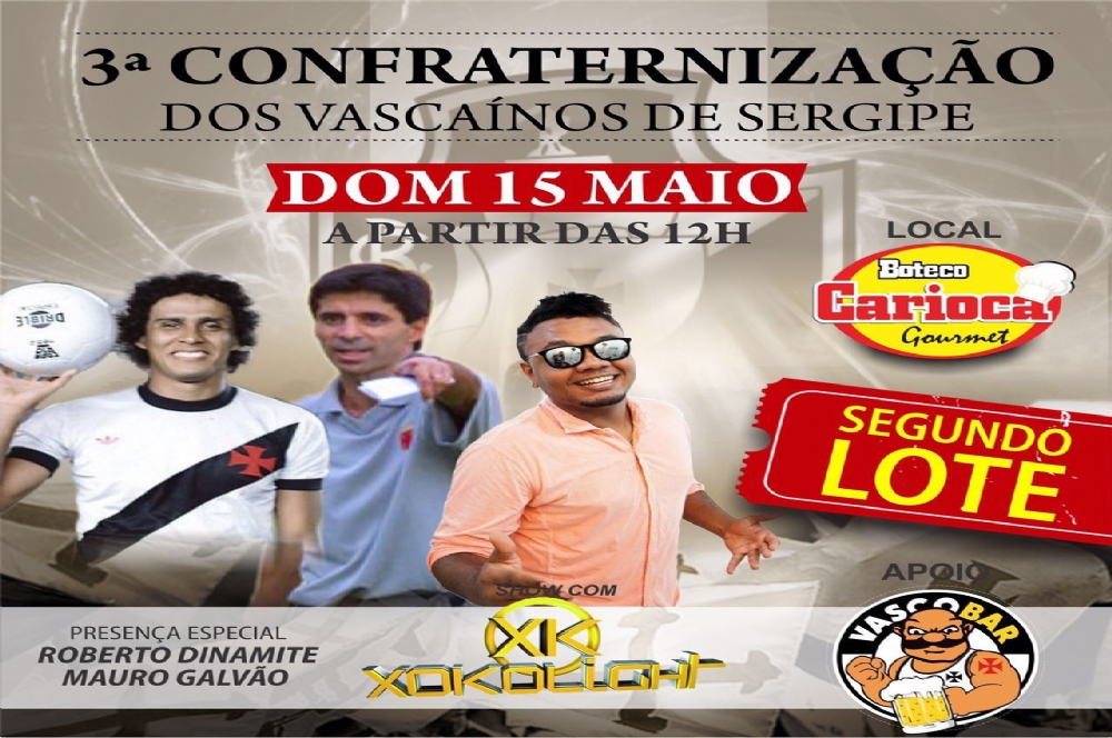 No dia 15 de maio, o Boteco Carioca será palco de mais um evento da torcida do Vasco do Estado. A partir das 12h, acontece a Confraternização dos Vascaínos de Sergipe, que em sua terceira edição conta com a participação dos ídolos Roberto Dinamite e Mauro Galvão. O evento, que conta com o apoio da VascoBar – torcida oficial recém-formada em Aracaju – será animado pela banda de samba Xokolight.