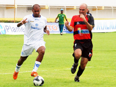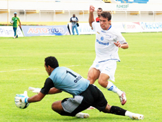as pernas do goleiro do Riachuelo e confirmou o aproveitamento de 100% do Confiança no estadual.