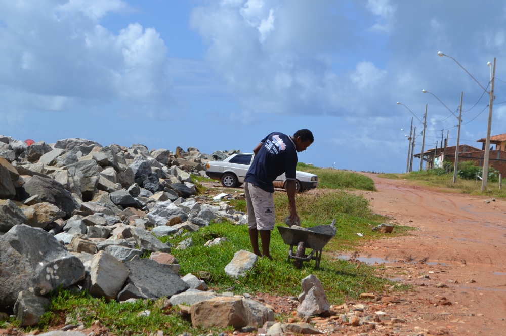 | Pedreiro remove pedras do molhe (Fotos: Cássia Santana/Portal Infonet) |