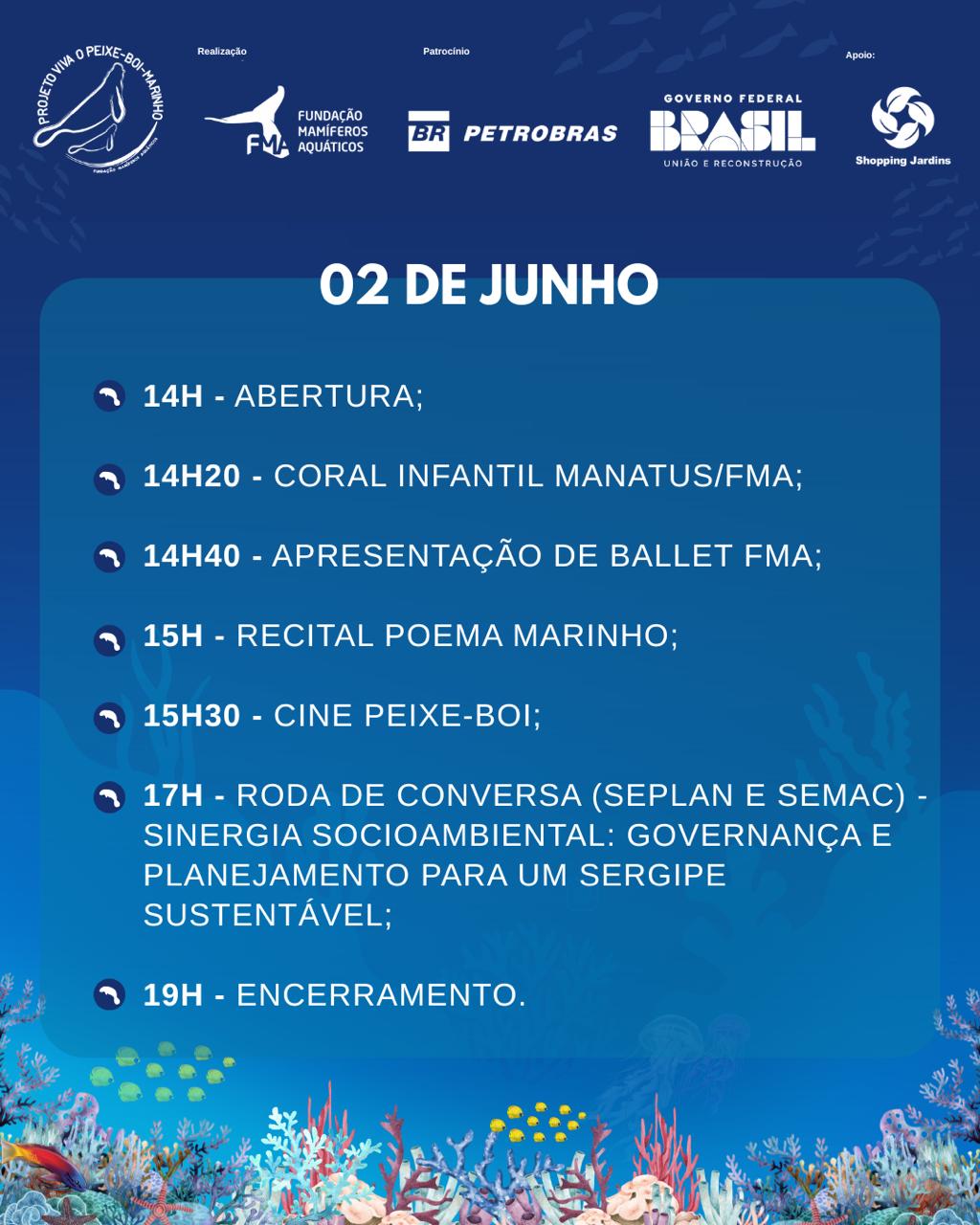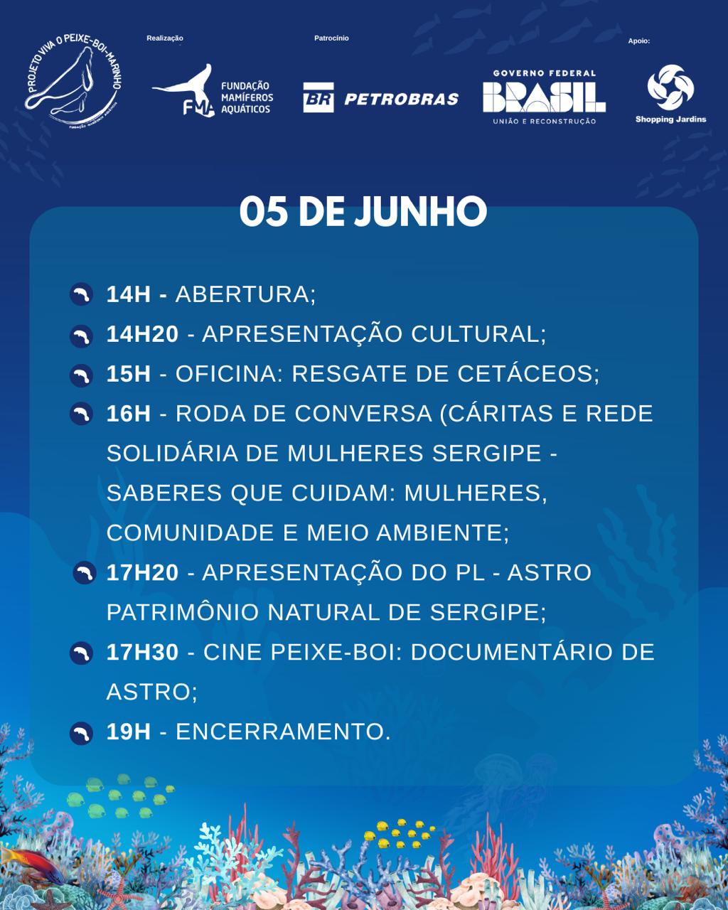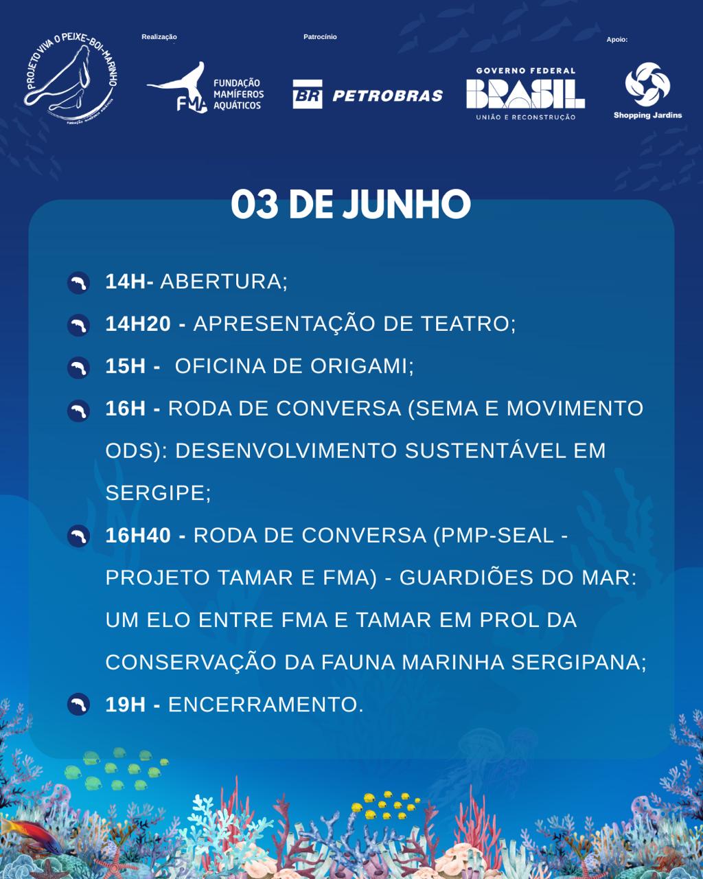 Entre os dias 2 e 6 de junho, das 14h às 19h, o Projeto Viva o Peixe-Boi Marinho realiza a “Semana do Meio Ambiente Viva o Peixe-Boi-Marinho” no Shopping Jardins em Aracaju, SE. A iniciativa irá unir instituições do estado que trabalham em prol do meio ambiente, contando com presença de órgãos públicos, organizações governamentais e da sociedade civil que irão fomentar a conscientização e mobilização da sociedade para a conservação ambiental. O Projeto Viva o Peixe-Boi-Marinho (PVPBM) é realizado pela Fundação Mamíferos Aquáticos com patrocínio da Petrobras e do Governo Federal por meio do Programa Petrobras Socioambiental.