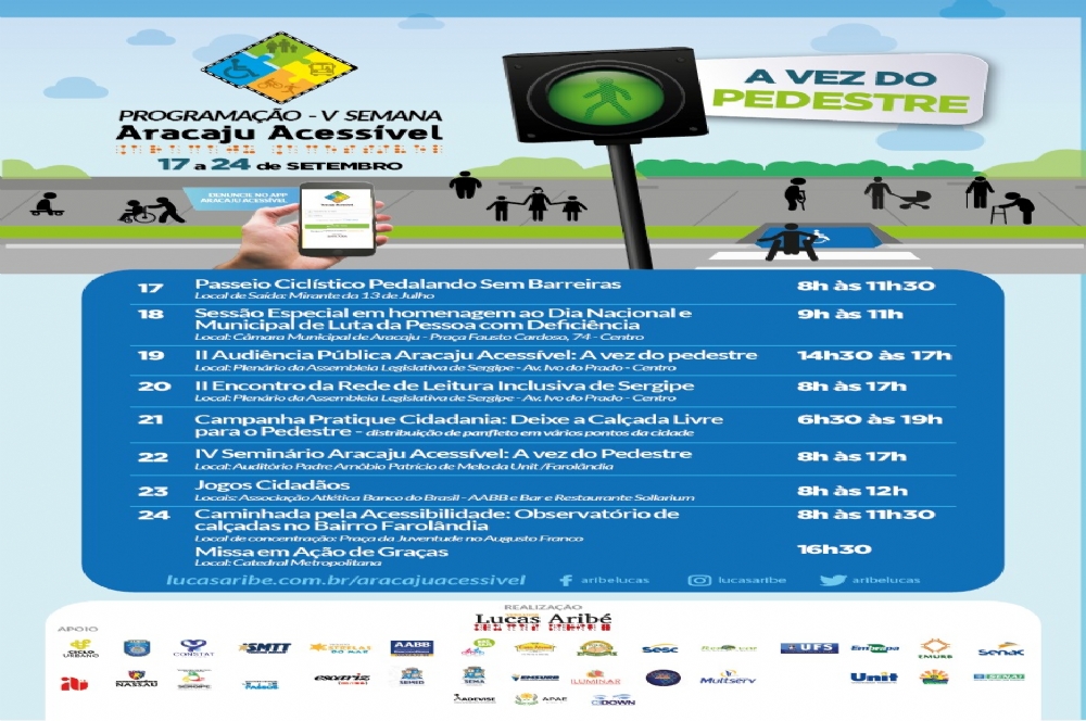 Já no dia 19, das 14h30 às 17h, ocorre a audiência pública no Plenário da Assembleia Legislativa de Sergipe, trazendo à população aracajuana, em conjunto com o poder público, discussão e reflexão sobre ‘A vez do pedestre’. A ideia é estimular ações de planejamento em torno do propósito maior do projeto que é fazer de Aracaju uma cidade sem barreiras. A audiência tem vagas limitadas e para se inscrever, basta acessar o site lucasaribe.com.br/aracajuacessivel entre o dia 1º e 18.