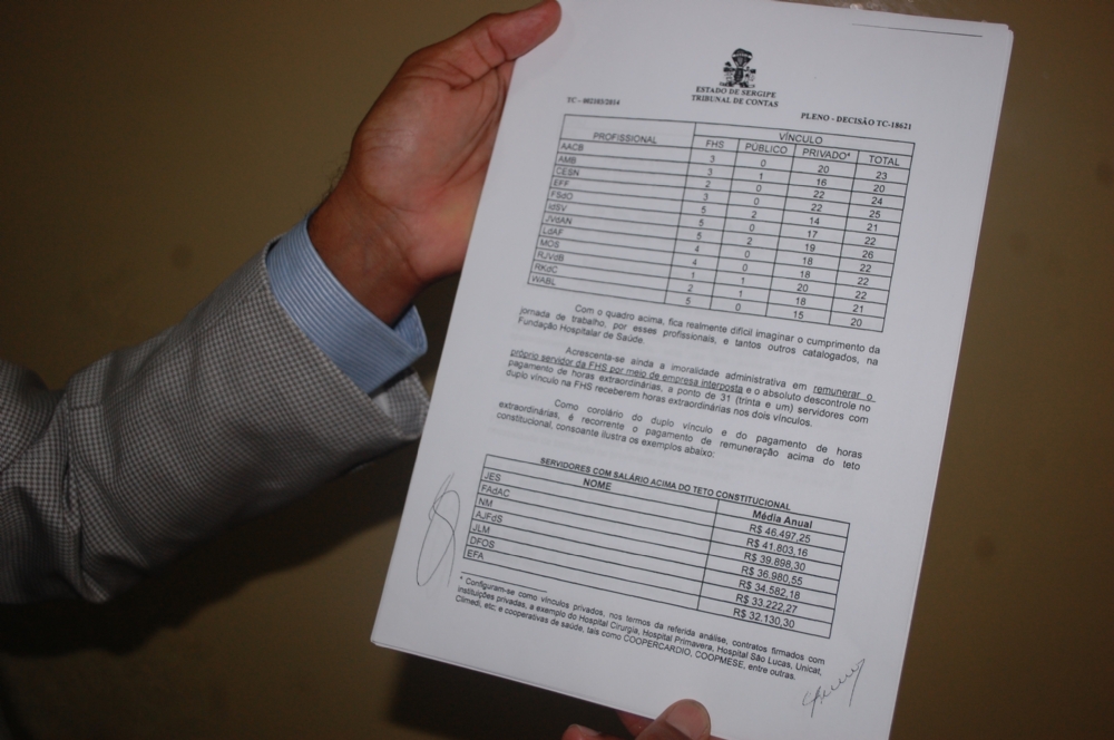 De acordo com Agamenon Sobral, estará divulgando nos próximos dias os nomes dos médicos com mais de 20 vínculos no Estado e no Município. “Por enquanto só tô dando as iniciais dos nomes, para depois eu citar nome a nome. A gente já tem um documento oficial do Tribunal de Contas de Sergipe, assinado pelo relator, o conselheiro Clóvis Barbosa de Melo, de médicos com mais de 20 vínculos e dos médicos que ganham acima do teto constitucional”, ressalta.
