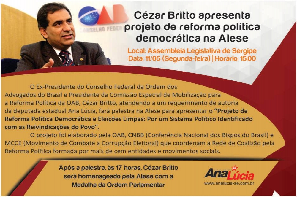 Na próxima segunda-feira, 11, às 15 horas, o ex-presidente do Conselho Federal e Presidente da Comissão Especial de Mobilização para a Reforma Política da Ordem dos Advogados do Brasil (OAB), Cézar Britto, atendendo a um requerimento de autoria da deputada estadual Ana Lúcia, fará uma palestra no grande expediente da Assembleia Legislativa de Sergipe (Alese) sobre o “Projeto de Reforma Política Democrática e Eleições Limpas: Por um Sistema Político Identificado com as Reivindicações do Povo”.