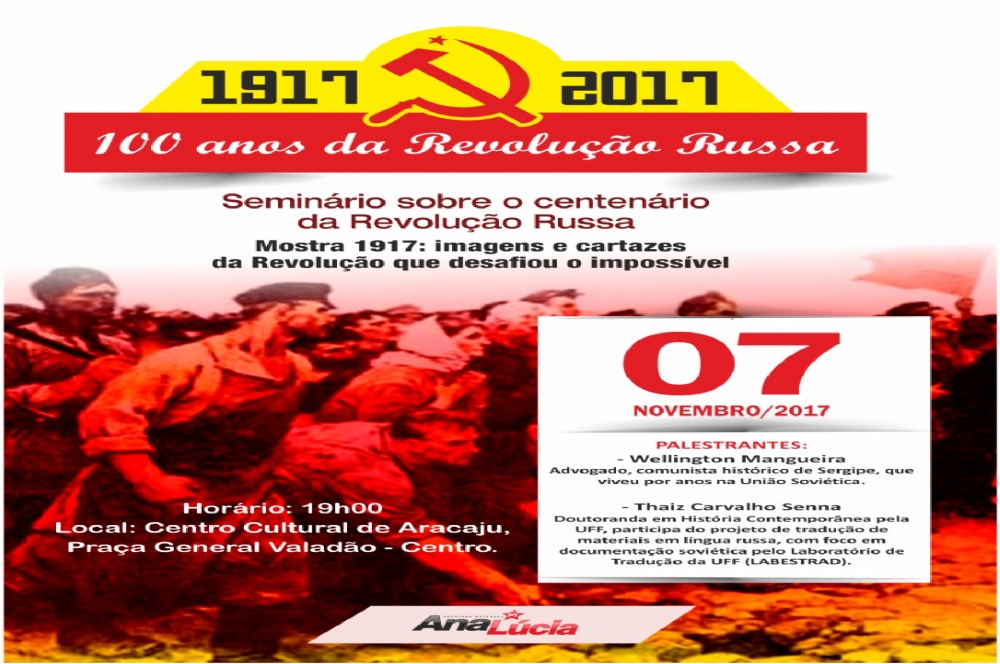 Na próxima terça-feira, 7, o Mandato Democrático e Popular da Deputada Estadual Ana Lúcia realizará o seminário "100 Anos da Revolução Russa" e lançará a mostra "1917: Imagens e Cartazes da Revolução que Desafiou o Impossível" no Centro Cultural de Aracaju, a partir das 19 horas.