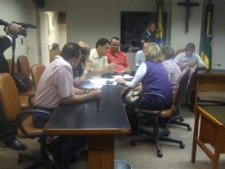 A Comissão formada por deputados estaduais com a finalidade de acompanhar o andamento das reuniões entre os policiais militares e o Governo, marcou o primeiro encontro para esta quarta-feira, 27, mesmo sabendo que muitos parlamentares estariam participando de um encontro da União Nacional dos Legislativos Estaduais (Unale), em Brasília. Resultado: para adiantar, as deputadas Ana Lúcia Menezes (PT) e Celinha Franco (DEM), receberam os representantes dos militares em uma conversa informal. Ana Lúcia e Celinha Franco escutam representantes dos policiais