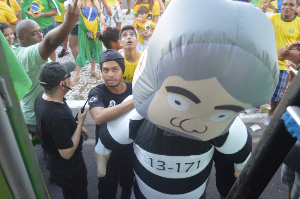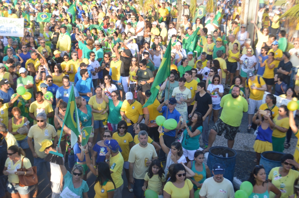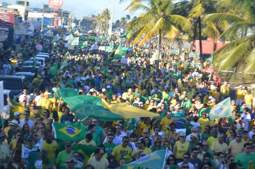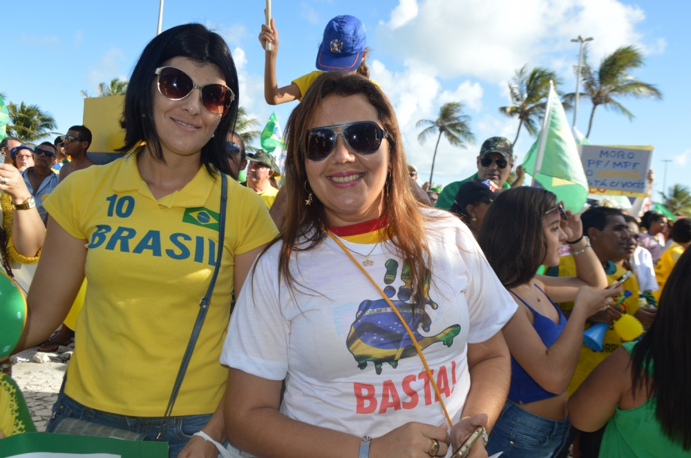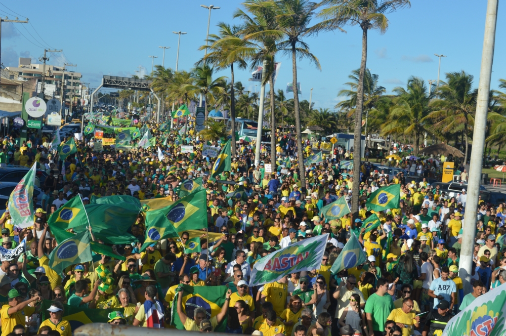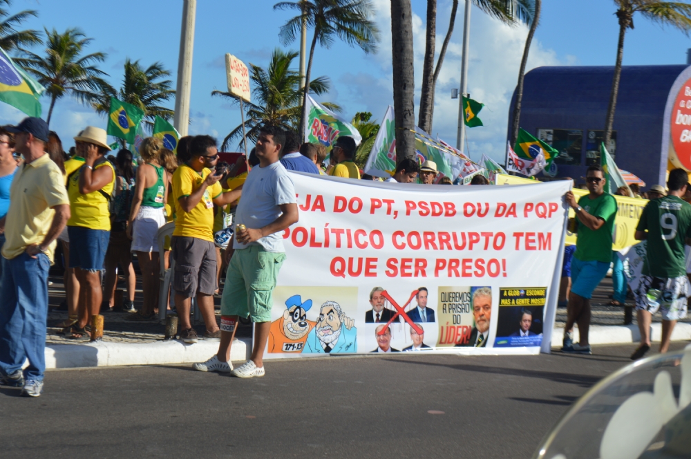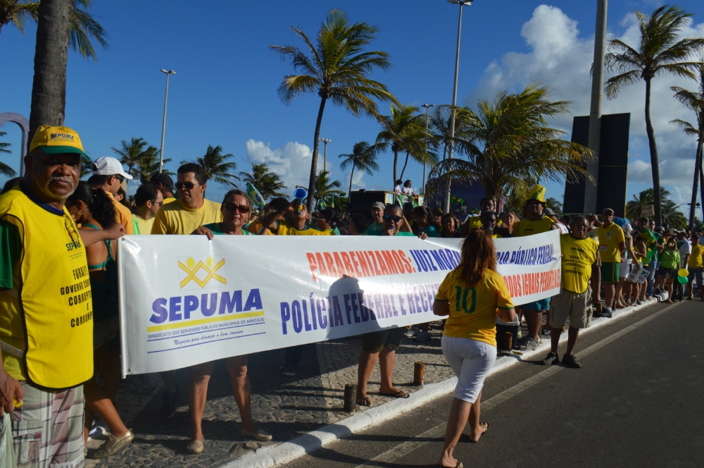 Uma multidão tomou a avenida principal da Orla de Atalaia [Av. Santos Dumont], na tarde deste domingo, 13, numa manifestação contra a corrupção no país e o Governo da presidente Dilma Rousseff (PT). A estimativa dos organizadores é de que mais de 10 mil pessoas tenham participado ato que começou nos Arcos e terminou na Passarela do Caranguejo. A Polícia Militar já divulgou o número de participantes, em torno de 8 mil.
