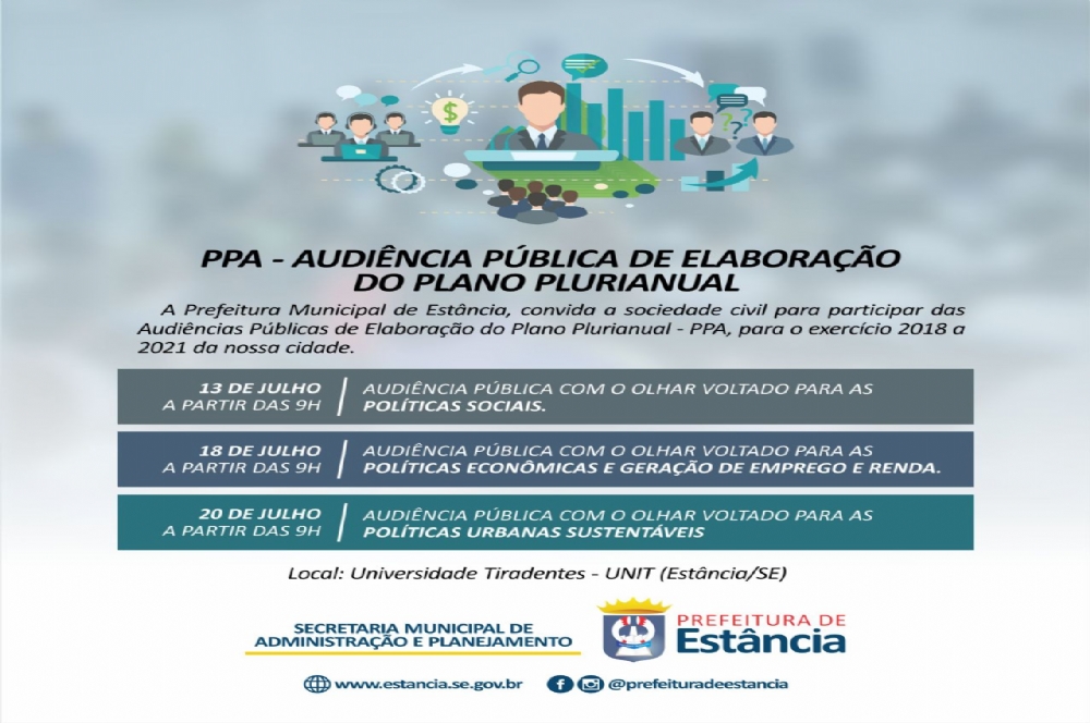 A Prefeitura de Estância vai promover neste mês de julho três audiências públicas de Elaboração do Plano Plurianual (PPA) para o quadriênio 2018-2021. Realizadas no auditório da Universidade Tiradentes (Unit), Campus-Estância, a ação tem o objetivo de contar com a participação da sociedade civil ouvindo a população para que contribua com a construção do plano de governo, por meio de propostas que estabeleçam as prioridades e metas de trabalho para os próximos quatro anos, tendo em vista promover os melhores resultados na gestão pública garantindo o equilíbrio entre receita e despesas do Orçamento.