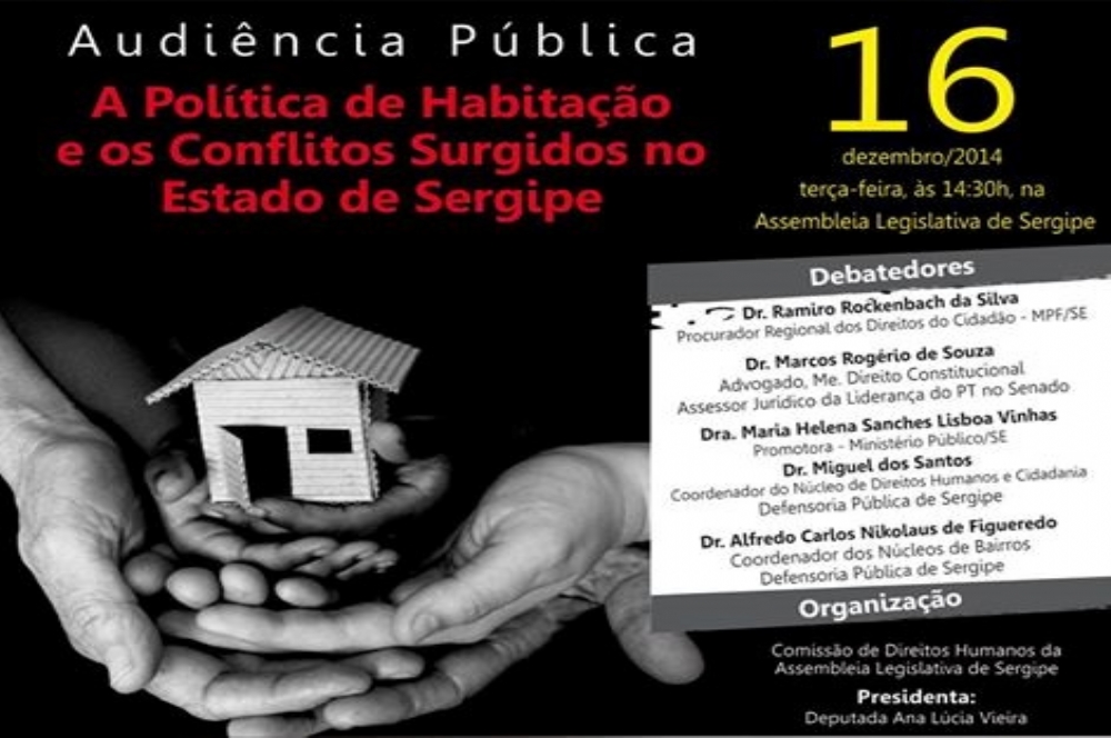 A deputada Ana Lúcia explica que, para debater o assunto, conhecer melhor as demandas da população e buscar encaminhamentos no sentido de minimizar o sofrimento das famílias que não têm onde morar ou que vivem em condições subumanas, estarão presentes na audiência diversas representações do poder público e representantes dos movimentos de luta por moradia digna. “A falta de um lugar para morar tem se tornado um dos mais graves problemas para as famílias sergipanas de baixa renda. Fruto das desigualdades sociais, esta problemática tem gerado diversos conflitos no campo e na cidade. Nós, poder público, precisamos debater esta temática e escutar quem vive esta realidade”, frisou a deputada Ana Lúcia.