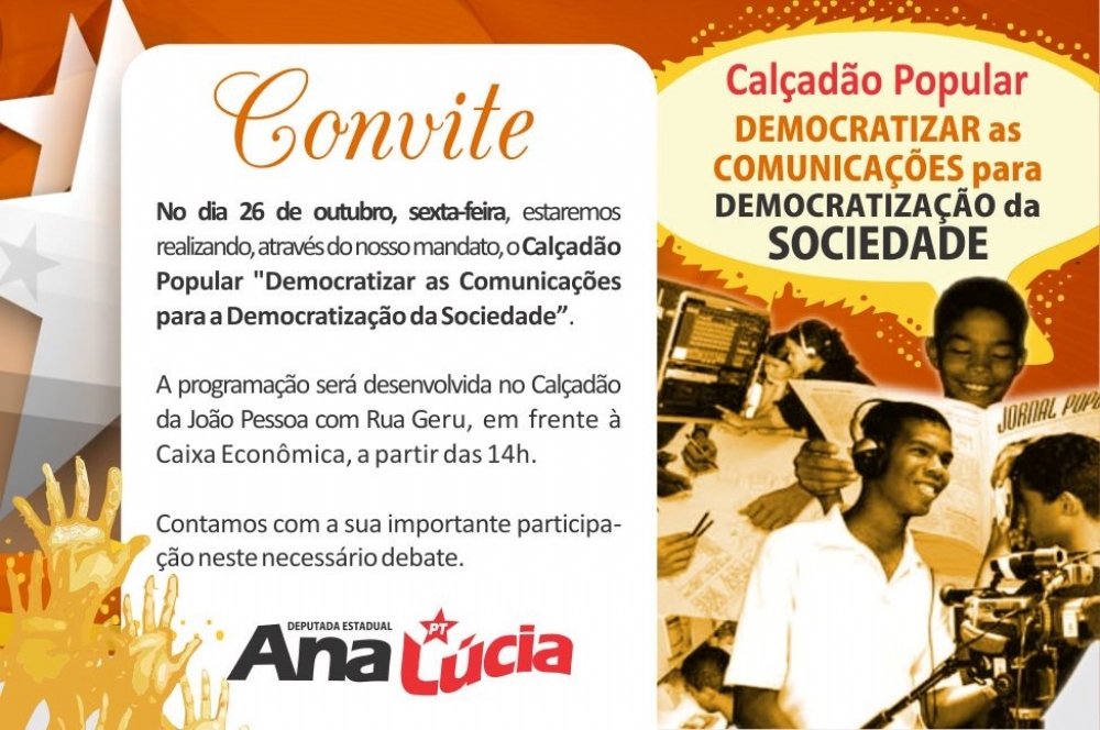 O tema “democratização da comunicação” vai estar no centro do debate em mais um Calçadão Popular, promovido pelo mandato da deputada Ana Lúcia (PT), que acontece nesta sexta-feira, a partir das 14 horas, no Calçadão da João Pessoa, próximo à Caixa Econômica.