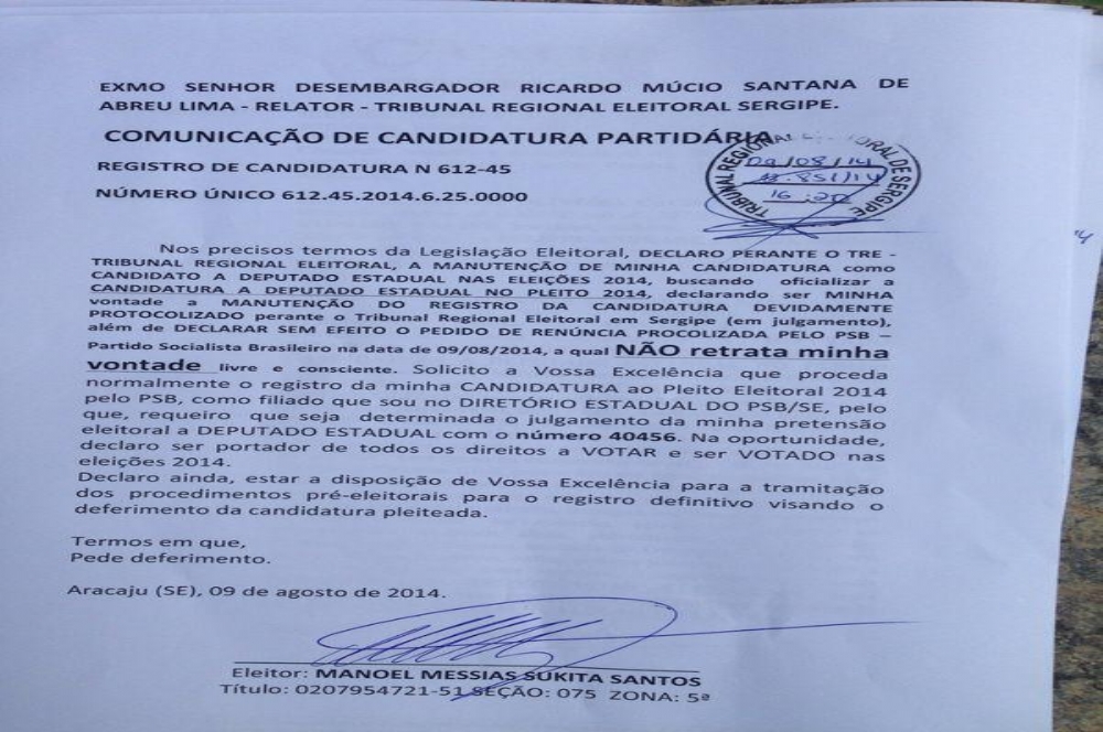 No dia 09 de agosto, o PSB apresentou ao TRE/SE pedido de suspensão da candidatura assinado por Sukita e duas testemunhas. Com a decisão de hoje, o ex-prefeito de Capela continua sub judice. O registro de candidatura foi negado após recurso da Procuradoria Regional Eleitoral (PRE/SE), mas a assessoria jurídica ainda pode recorrer.