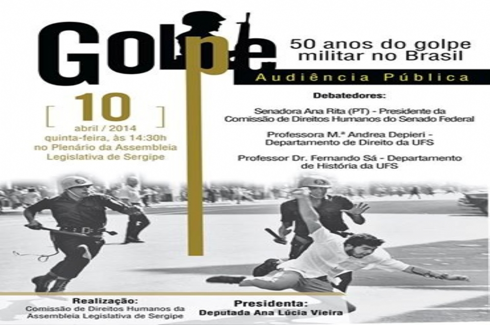 Para discutir as consequências da ditadura militar no Brasil, em alusão aos 50 anos do Golpe Militar, a Comissão de Direitos Humanos da Assembleia Legislativa, presidida pela deputada Ana Lúcia (PT), e a Comissão de Direitos Humanos do Senado Federal, presidida pela Senadora Ana Rita (PT), realizam a Audiência Pública “50 anos do Golpe Militar no Brasil”. A solenidade será realizada no dia 10 de abril, quinta-feira, às 14h30, no plenário da Alese.