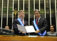 Numa sessão histórica, o governador Marcelo Déda, representando o povo de Sergipe, homenageou a Câmara dos Deputados e o Senado Federal com a mais alta comenda do estado, a Medalha do Mérito Aperipê, no grau máximo, a Grã-Cruz. A condecoração, inédita, pois distinguida a instituições e não a personalidades, simboliza uma reverência à democracia. A sessão, nesta terça-feira, 5, em Brasília, foi iniciativa do deputado André Moura.