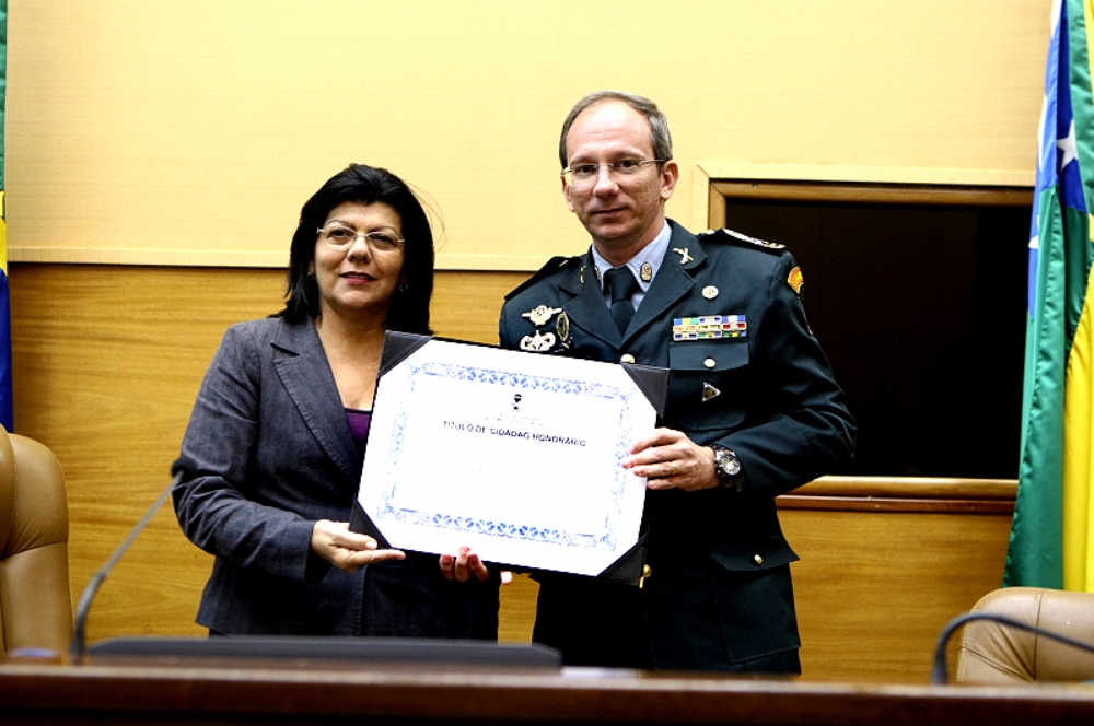 | DeputadaAngélica Guimarães entrega o título ao coronel Maurício Iunes (Foto: César de Oliveira) |
