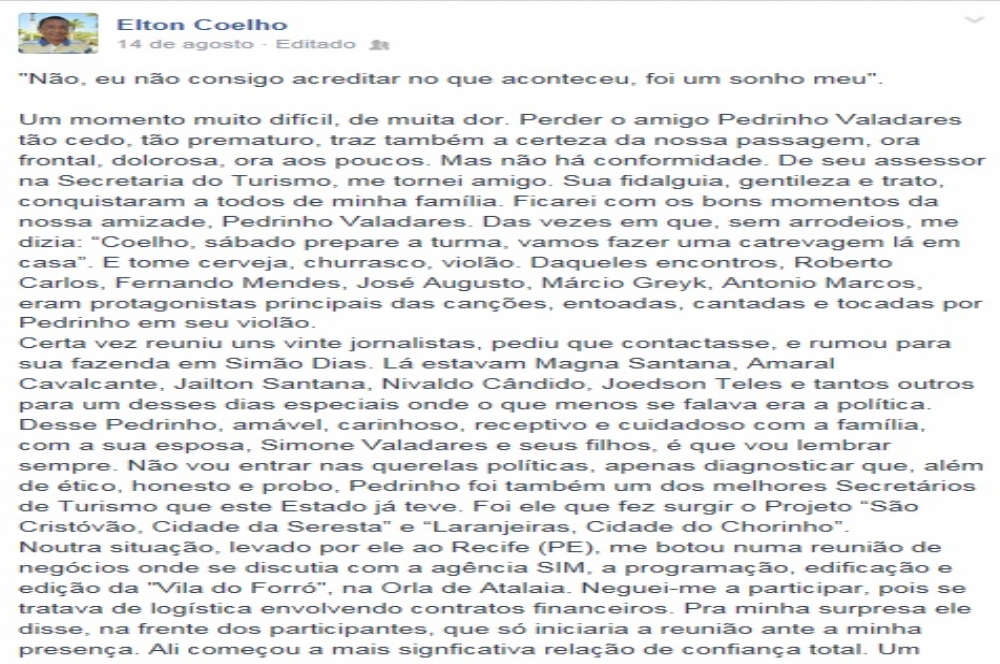 “Um momento muito difícil, de muita dor. Perder o amigo Pedrinho Valadares tão cedo, tão prematuro, traz também a certeza da nossa passagem, ora frontal, dolorosa, ora aos poucos. Mas não há conformidade. De seu assessor na Secretaria do Turismo, me tornei amigo. Sua fidalguia, gentileza e trato, conquistaram a todos de minha família. Ficarei com os bons momentos da nossa amizade, Pedrinho Valadares. Das vezes em que, sem arrodeios, me dizia: “Coelho, sábado prepare a turma, vamos fazer uma catrevagem lá em casa”. E tome cerveja, churrasco, violão. Daqueles encontros, Roberto Carlos, Fernando Mendes, José Augusto, Márcio Greyk, Antonio Marcos, eram protagonistas principais das canções, entoadas, cantadas e tocadas por Pedrinho em seu violão”, parte do depoimento postado pelo jornalista e amigo de Pedrinho, Elton Coelho.