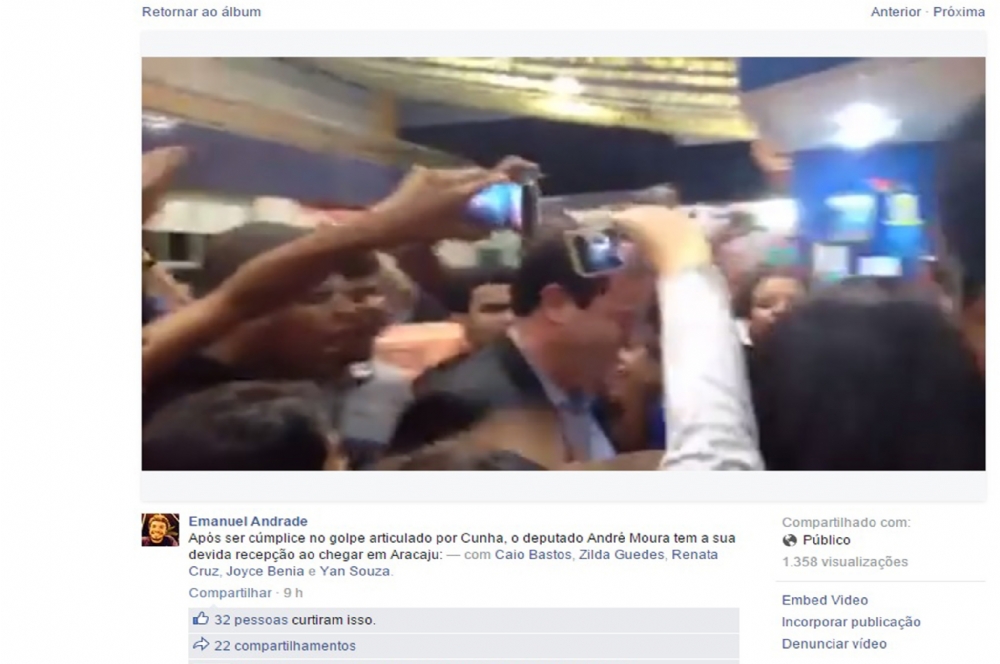 Emanuel registrou o encontro do deputado André Moura com os manifestantes em vídeo, postado na página pessoal do estudante no facebook. No vídeo, o parlamentar aparece sorrindo, atravessando uma espécie de corredor formado pelos manifestantes que, em coro, gritavam “não, não, não, não à redução”. “Após ser cúmplice no golpe articulado por Cunha [Eduardo (PMDB), presidente da Câmara], o deputado André Moura tem a sua devida recepção ao chegar em Aracaju”, retrata o texto postado pelo estudante no face.
