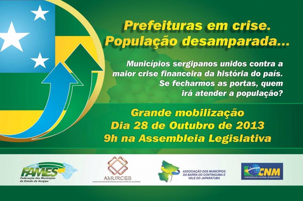 Na próxima segunda-feira,28, os prefeitos dos municípios sergipanos vão trocar o gabinete das prefeituras pelas galerias da Assembleia Legislativa. Isso porque às 9h, os gestores vai se reunir para o ato público denominado de “Sergipe Unido Contra a Crise nos Municípios”. A mobilização foi organizada pelas três entidades municipalistas: Federação dos Municípios do Estado de Sergipe (Fames), Associação dos Municípios da Região do Centro Sul (Amurces) e Associação dos Municípios da Barra do Cotinguiba e Vale do Japaratuba (Ambarco), com o apoio da Confederação Nacional dos Municípios.