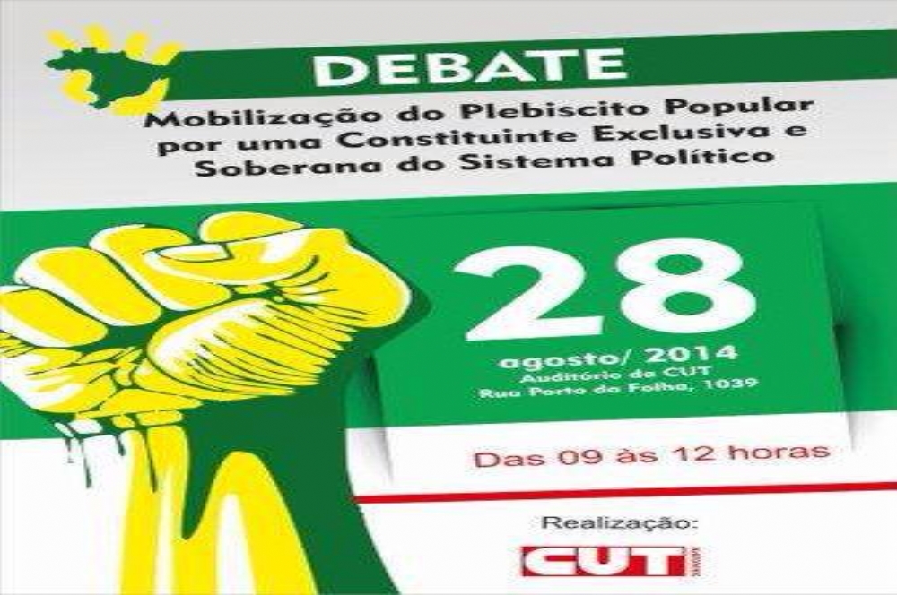 Às vésperas da Semana da Pátria, a Central Única dos Trabalhadores realiza em Aracaju o debate “Mobilização do Plebiscito Popular por uma Constituinte Exclusiva e Soberana do Sistema Político”, nesta quinta-feira, dia 28 de agosto, das 9h ao meio dia, no auditório da CUT/SE, localizado na Rua Porto da Folha, 1039, bairro Getúlio Vargas.