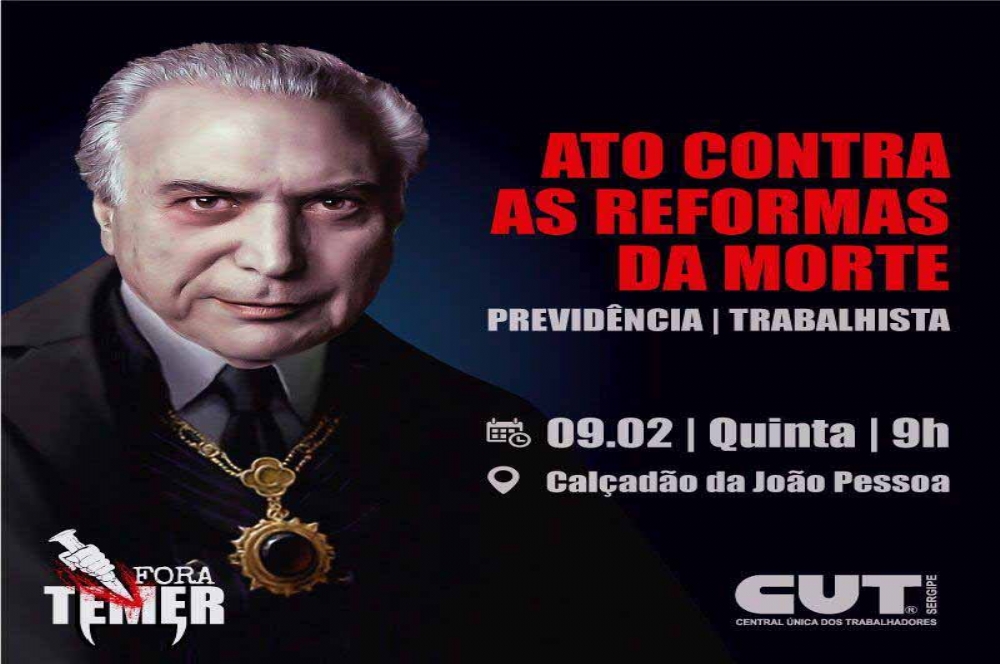A Central Sindical está convocando sindicatos filiados e convidando a população sergipana para uma mobilização denominada 'Ato contra as reformas da morte: Previdência e Trabalhista', que será realizada a partir das 9h da quinta-feira, 9, no Calçadão da João Pessoa, Centro de Aracaju.