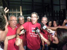 “Hoje não é dia de fazer análises. É dia de comemorar. Foi uma eleição difícil, apertada. Quando nossa candidatura apresentava folga, houve um crescimento do adversário na última semana, mas não abalou o núcleo que sustenta esse projeto e essa é a quarta eleição em que eu venço no 1º turno”. Foi o que afirmou o governador reeleito de Sergipe, com 52,8% dos votos, Marcelo Déda (PT), em sua primeira entrevista ao deixar o apartamento para a festa na Av. Barão de Maruim. Marcelo Déda recebe a imprensa para a primeira entrevista (Fotos: Portal Infonet)