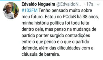 O prefeito de Aracaju, Edvaldo Nogueira, voltou a comentar que pretende deixar o Partido Comunista do Brasil (PC do B), o qual é filiado há 38 anos. Em seu twitter, Edvaldo relembra que foi neste partido que fez toda sua trajetória política, mas confessa que atualmente existem divergências de pensamentos. “Penso na mudança de partido por ter surgido contradições entre o que penso e o que o partido defende, além das dificuldades com a cláusula de barreira”, postou.