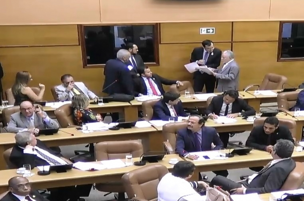 | Ao fundo, Georgeo e Gualberto negociam emendas (Foto: reprodução transmissão ao vivo da sessão pela internet) |