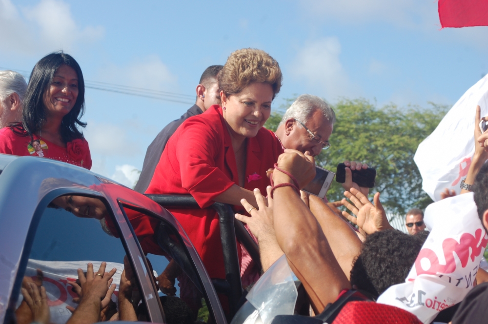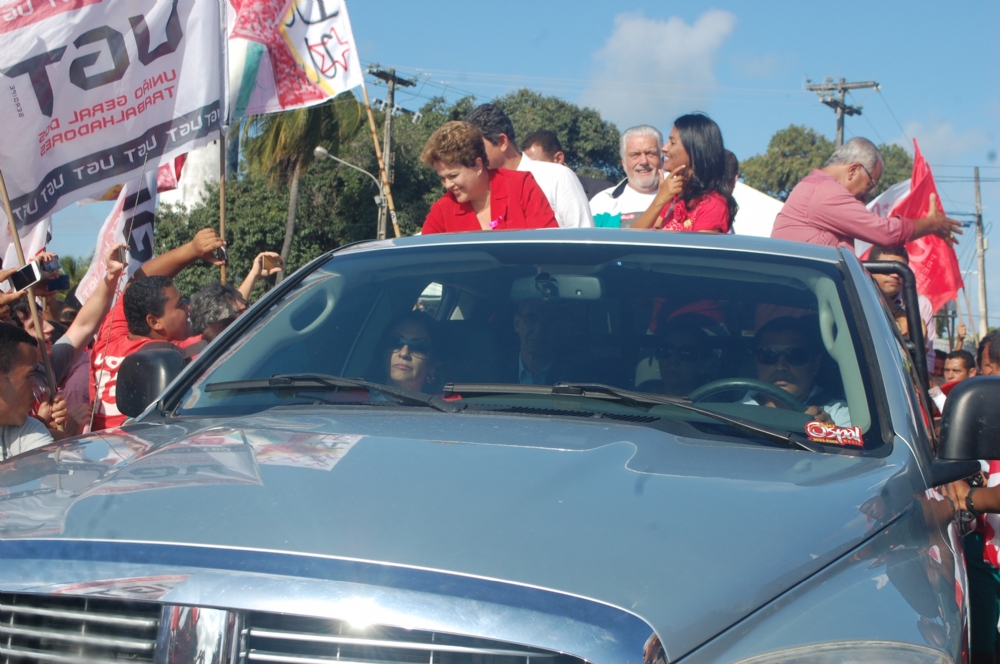A presidente Dilma Rousseff, candidata à reeleição pelo Partido dos Trabalhadores cumpriu agenda na tarde desta quinta-feira, 9, na capital sergipana. Ao chegar ao Aeroporto de Aracaju, ela foi recepcionada pela coordenadora da campanha em Sergipe, Eliane Aquino, pelo governador Jackson Barreto (PMDB), pelo presidente estadual do PT, Rogério Carvalho e pelos eleitores que apoiam o seu retorno em 26 de outubro de 2014. Seguiu em carro aberto e fez discursos no Espaço Emes, saindo para o Estado de Alagoas sem falar com a imprensa.