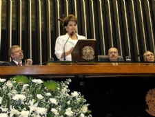 Depois de tomar posse no Congresso Nacional, Dilma Rousseff faz o primeiro pronunciamento como presidenta da República. Emocionada, ela foi muito aplaudida pelos presentes. A presidenta disse que ter sido eleita para comandar o país é uma homenagem a todas as mulheres brasileiras.