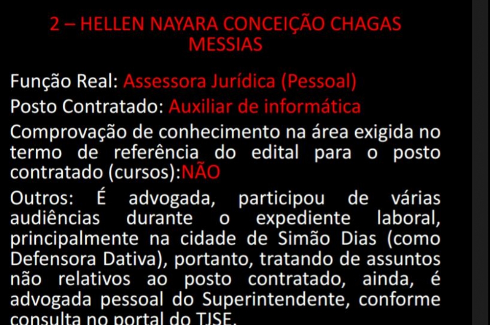 Além de Danilo Carvalho, aparecem os nomes de Hellen Nayara Conceição Chagas Messias, como assessora jurídica, mas que teria sido contratada como auxiliar de informática e Isaac Vinicius dos Santos, que também estaria em desvio de função.
