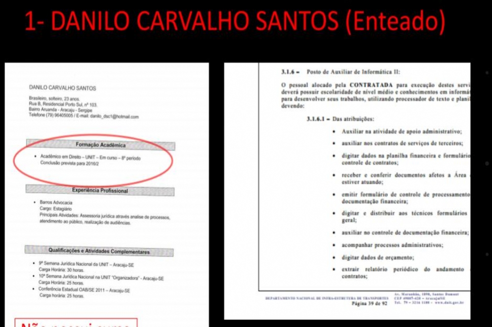 Em nota, Issac Vinícius da Silva, apontado na denúncia como funcionário em desvio de função, explicou que foi contratado pela empresa Airton Gomes no dia 5 de outubro de 2015, quando era 10º período de Direito, para o cargo de atendente de informática no DNIT, cuja exigência na licitação do contrato da empresa era apenas a escolaridade nível médio.
