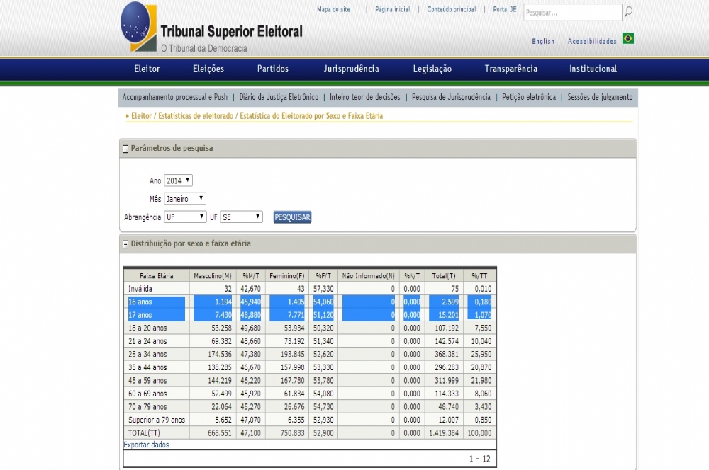 De acordo com dados do Tribunal Superior Eleitoral (TSE), em Sergipe o público que não possui a obrigatoriedade do voto, ou seja, têm entre 16 e 17 anos, representa 1,25% do total de eleitores.
