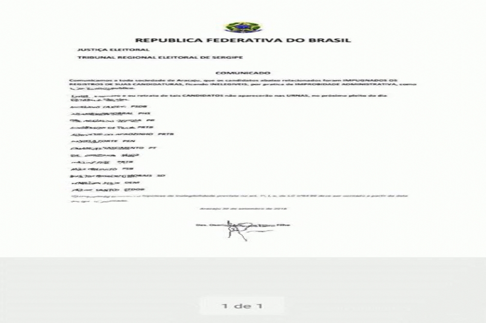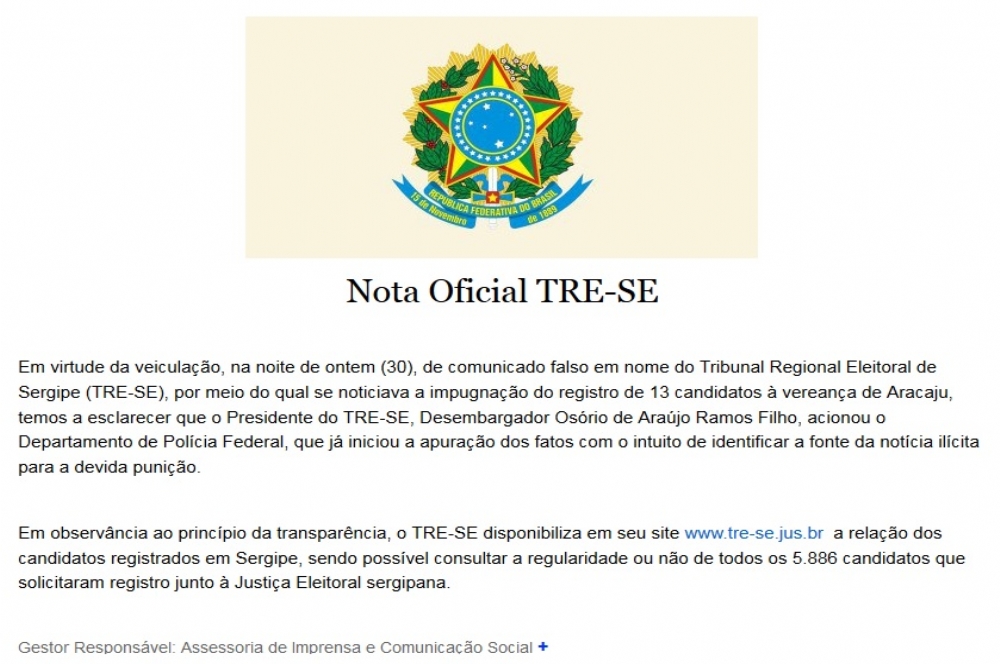 Faltando poucas horas para o início das Eleições 2016, a divulgação de uma falsa lista com nomes de candidatos, ao cargo de vereador por Aracaju, que estariam com candidaturas impugnadas movimentou o Tribunal Regional Eleitoral em Sergipe na manhã deste sábado, 1º. O documento falso, que constava com uma assinatura creditada ao presidente do TRE, Desembargador Osório de Araújo Ramos Filho, circulou nas redes sociais.