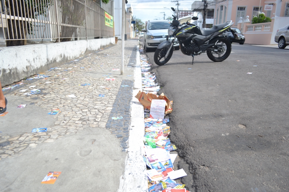 Apesar da ausência de eleitores, neste período da tarde, na frente da escola uma grande quantidade de papeis de campanha. O lixo acumulado também cobre à calçada.