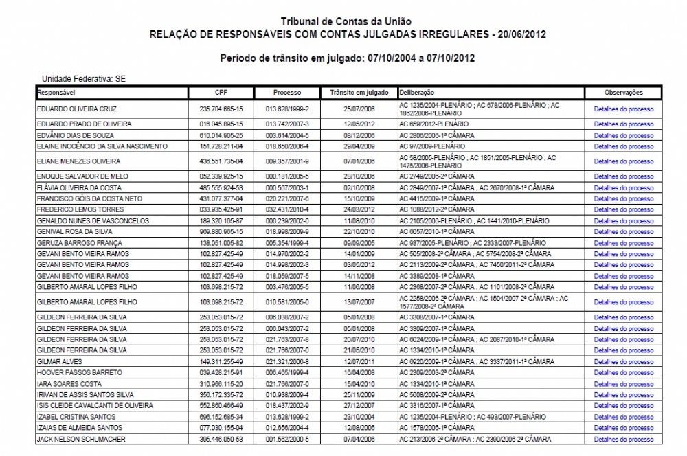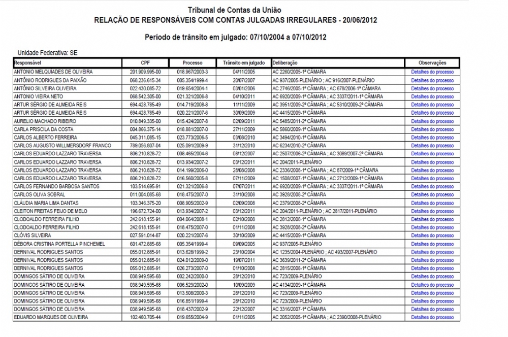 Em 2012, o primeiro turno das eleições será no dia 7 de outubro e a lista elaborada pelo TCU deverá conter todos os responsáveis que se enquadrem nos critérios legais desde 7 de outubro de 2004. A lista será atualizada diariamente. Consulte o portal do TCU em “eleições”. Acesse a lista completa no site.