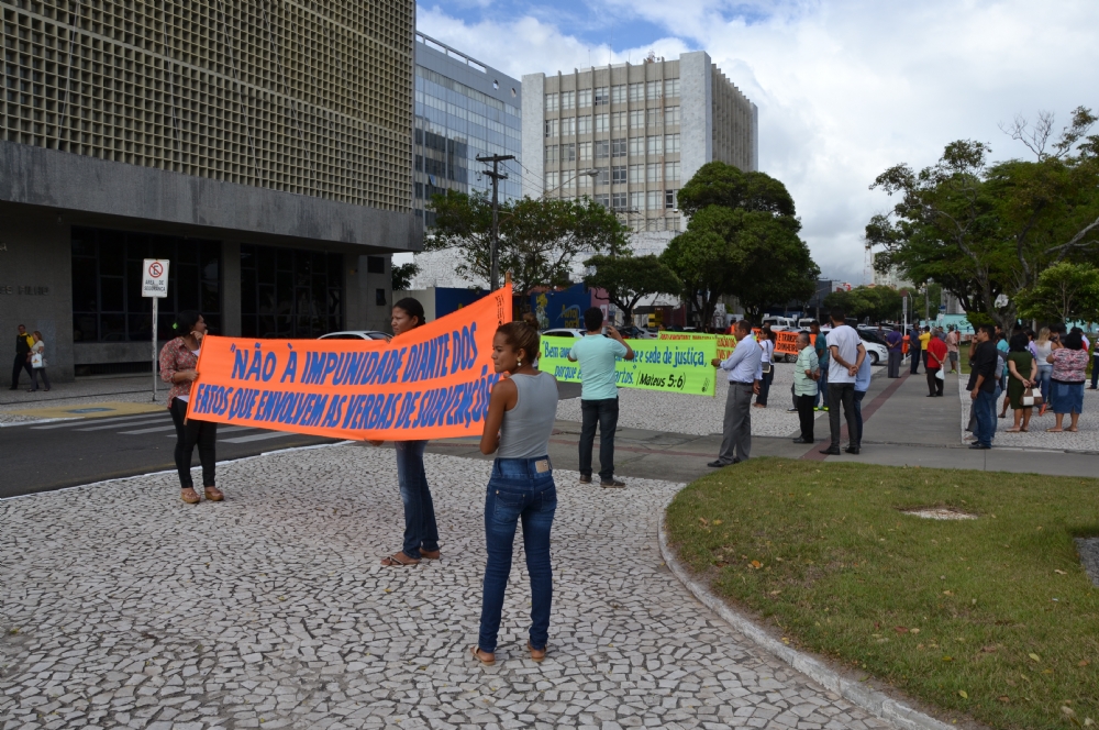 Com faixas e cartazes, os evangélicos se concentraram na praça Fausto Cardoso na manhã desta quinta-feira, 4, para cobrar transparência.