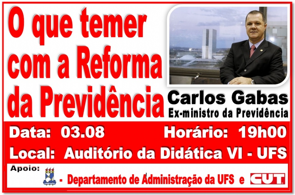 O ex-ministro da Previdência Social, Carlos Gabas, estará em Aracaju para participar de duas audiências públicas sobre a reforma da Previdência. Os eventos ocorrerão na quinta-feira (3) e na sexta-feira (4). O convite para Gabas foi feito pelo vice-presidente nacional do PT, Márcio Macêdo, que atendeu a uma solicitação do Diretório do PT de Aracaju e de sindicatos do Estado. “O que temer com a Reforma da Previdência” é o mote principal dos debates.
