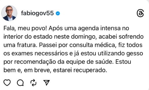 Fábio Mitidieri foi levado ao hospital, realizou todos os exames e passa bem. “Fala, meu povo! Após uma agenda intensa no interior do estado neste domingo, acabei sofrendo uma fratura. Passei por consulta médica, fiz todos os exames necessários e já estou utilizando gesso por recomendação da equipe de saúde. Estou bem e, em breve, estarei recuperado”.