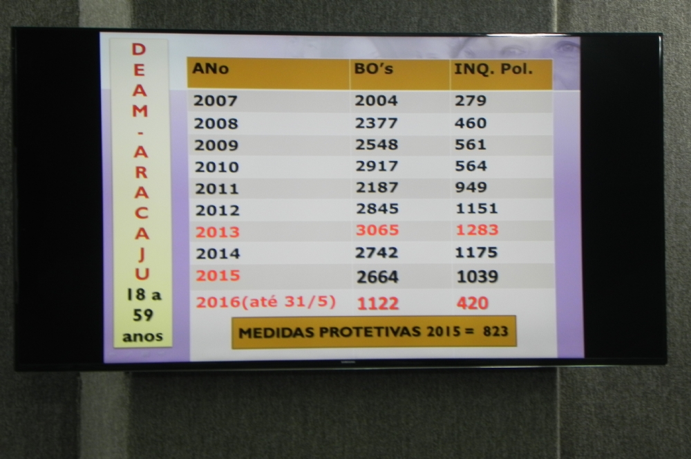 Para Adélia Pessoa, esse tipo de violência é cultural, e, portanto, aprendida desde criança. Em seu discurso, ela trouxe os dados da Delegacia Especial de Atendimento à Mulher (DEAM) sobre os números de inquéritos policiais e boletins de ocorrência envolvendo agressões contra mulheres na cidade de Aracaju desde 2007. De acordo com os dados, só até maio deste ano, já foram 1122 BO’s e 420 inquéritos. Porém, segundo ela, a violência sofrida pelas mulheres vai além da física e está inclusive nas oportunidades, divisão do tempo e das tarefas de casa.