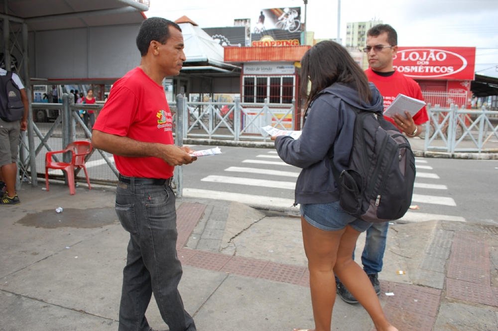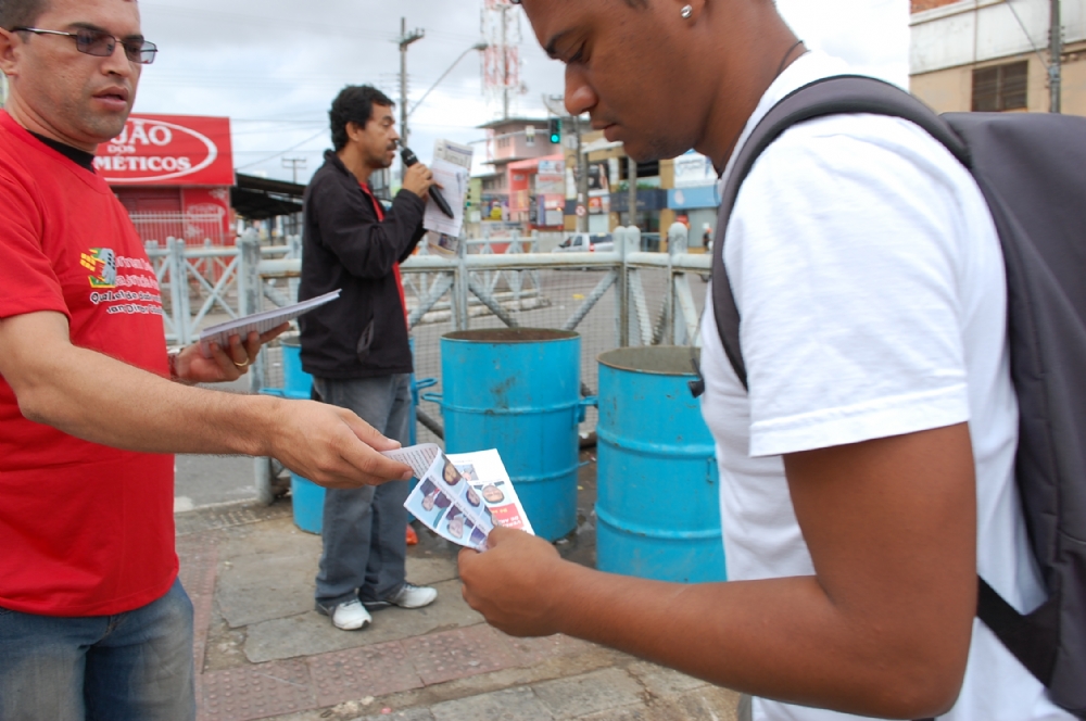 | Manifestantes entregam panfletos aos usuários do transporte coletivo |