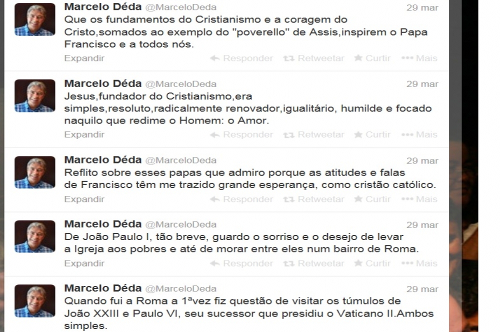 Religioso, Marcelo Déda também falou sobre o Papa Francisco. "Reflito sobre esses papas que admiro porque as atitudes e falas de Francisco têm me trazido grande esperança, como cristão católico. Jesus,fundador do Cristianismo,era simples,resoluto,radicalmente renovador,igualitário, humilde e focado naquilo que redime o Homem: o Amor. Que os fundamentos do Cristianismo e a coragem do Cristo,somados ao exemplo do "poverello" de Assis,inspirem o Papa Francisco e a todos nós", escreveu em uma rede social.