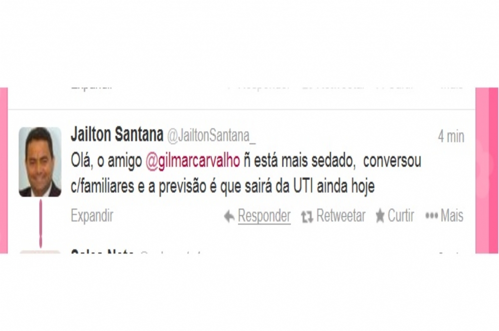 De acordo com o vereador e amigo, Jailton Santana, Gilmar não está mais sedado. Jailton informou por meio do Twitter que ele conversou com familiares e a previsão é de saída da UTI ainda nesta segunda-feira, 2.