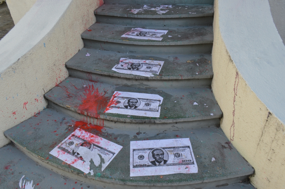 Cartazes contra o presidente da Câmara Federal, Eduardo Cunha colados nas escadas |