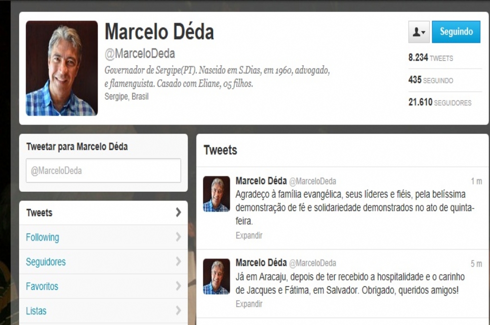 Pelo twitter, neste domingo, 4, Déda postou “Agradeço à família evangélica, seus líderes e fiéis, pela belíssima demonstração de fé e solidariedade demonstrados no ato de quinta-feira”, fazendo referência a um culto evangélico realizado na última quinta-feira1º, no Teatro Tobias Barreto.